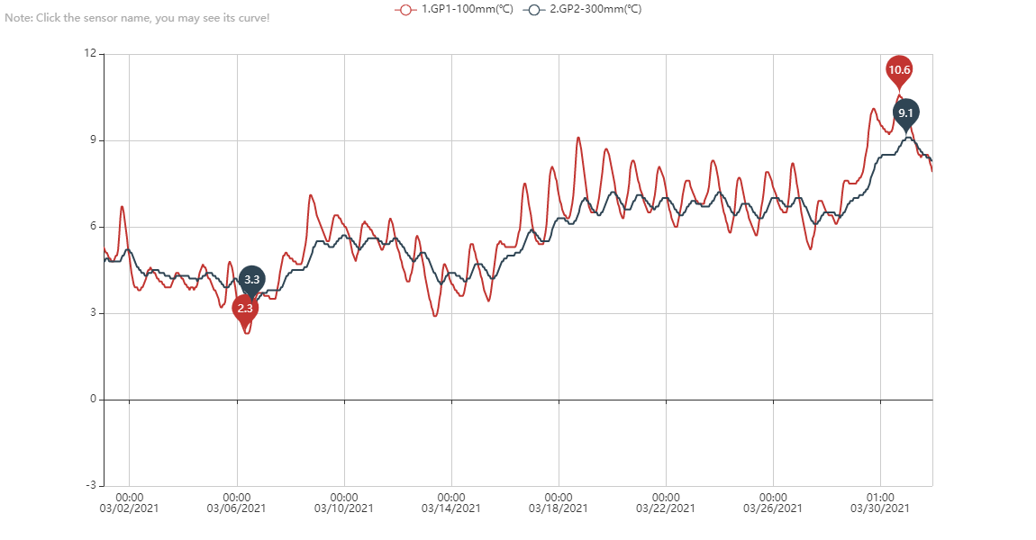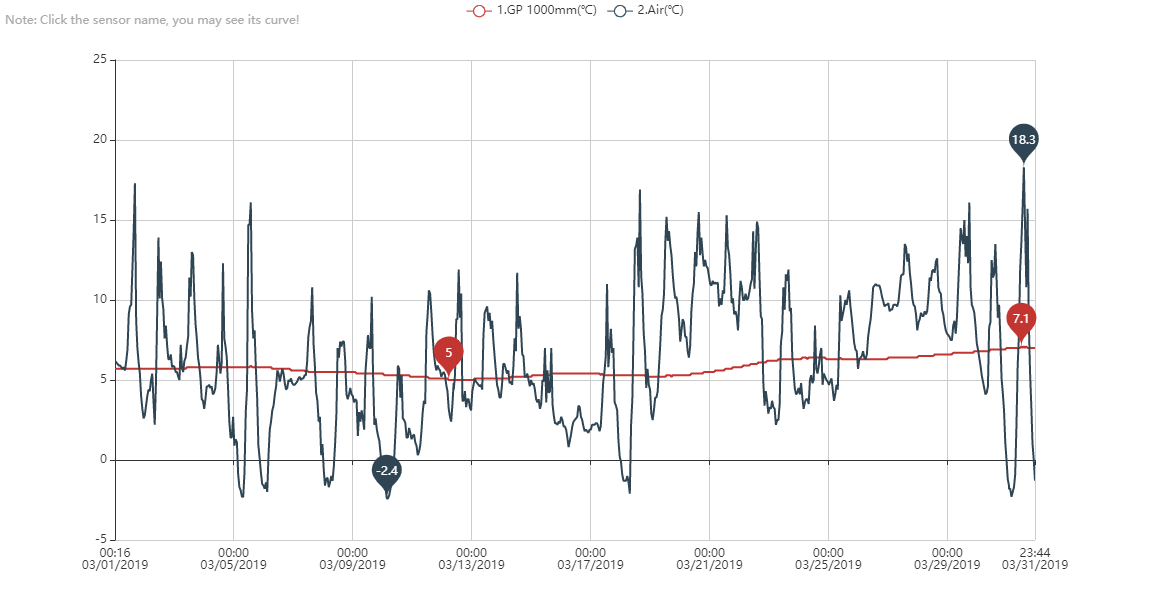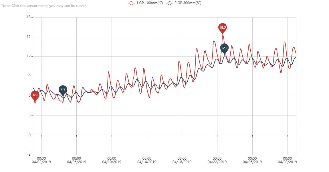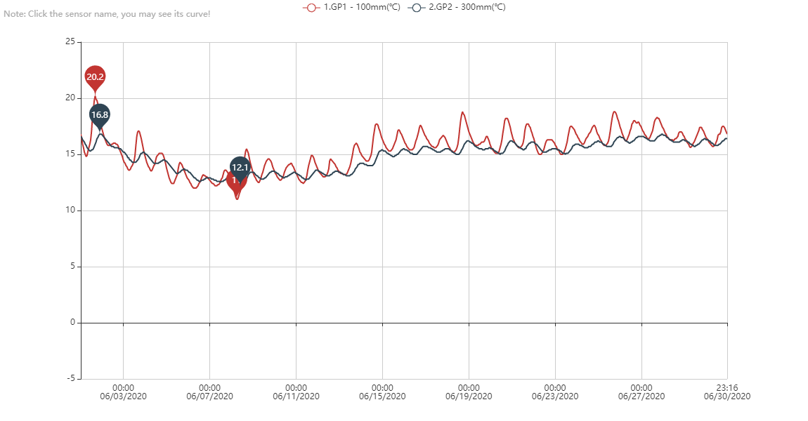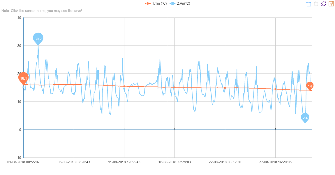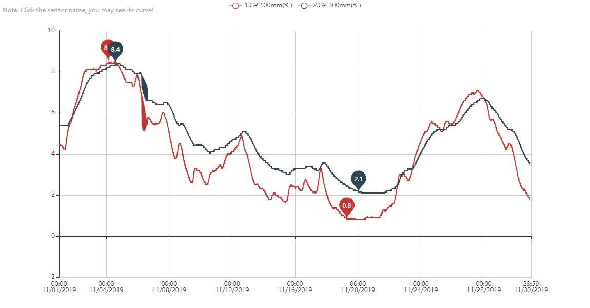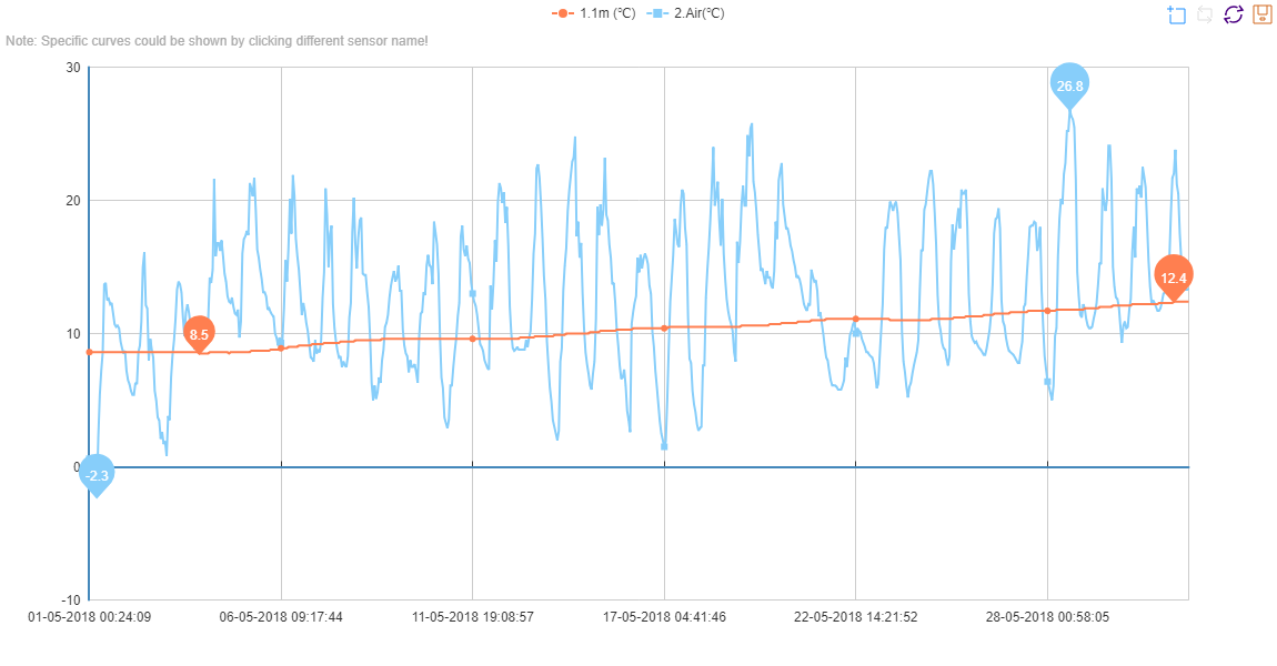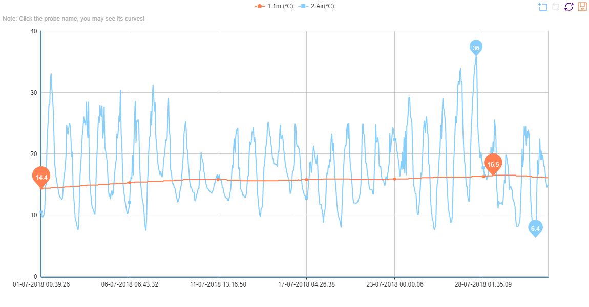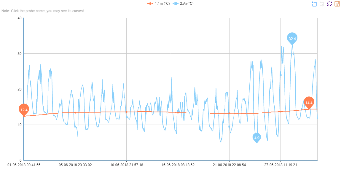 There are three GROUND PROBES set at 100mm, 300mm and 1000mm depths placed in an open grass field at the Millbank PWS Munlochy. The probes are attached to Elitech RCW-600 Intelligent WiFi Data Loggers. There is also one additional probe mounted inside a thermal screen set at 300mm above the grass that measures the air temperature as a control. Click on the probe depth below the date to access the data.