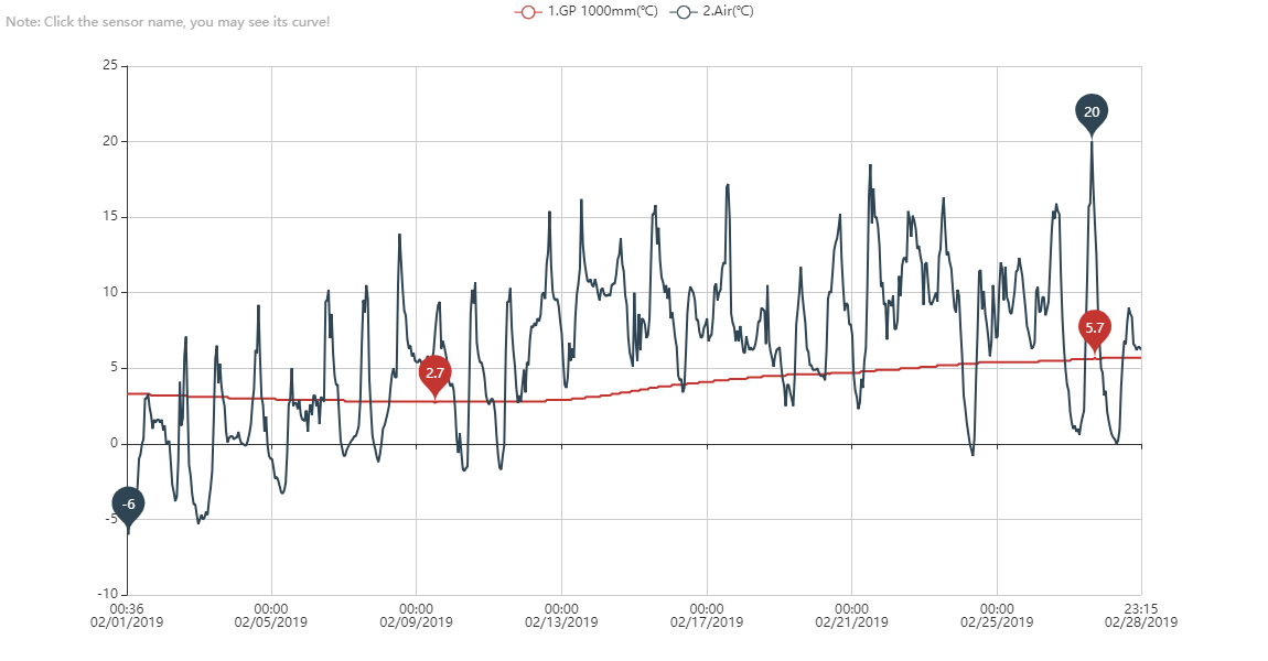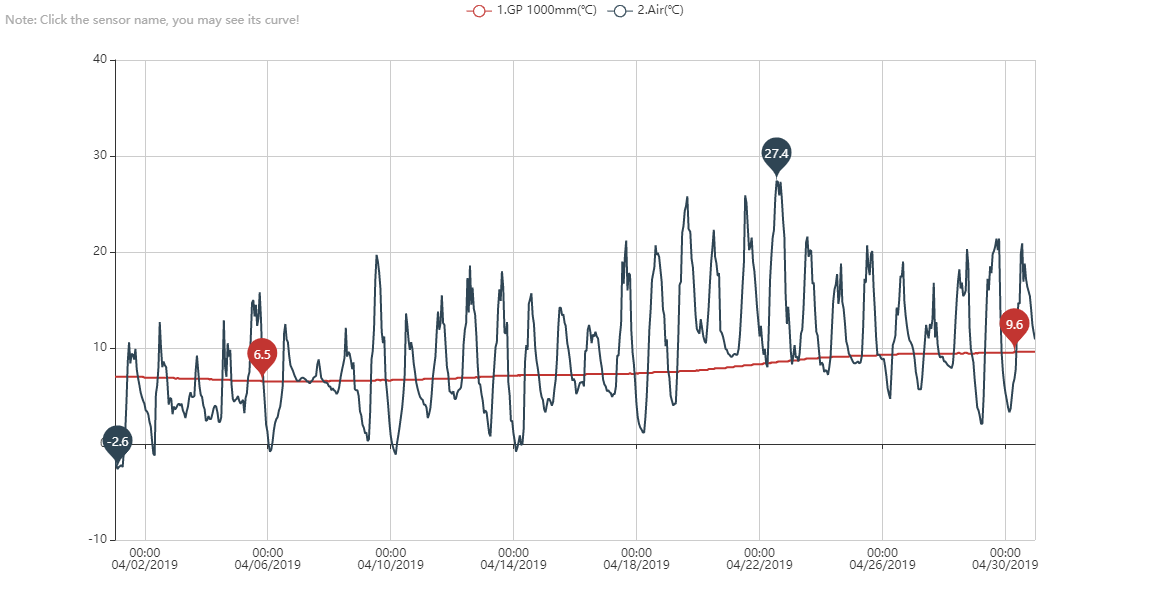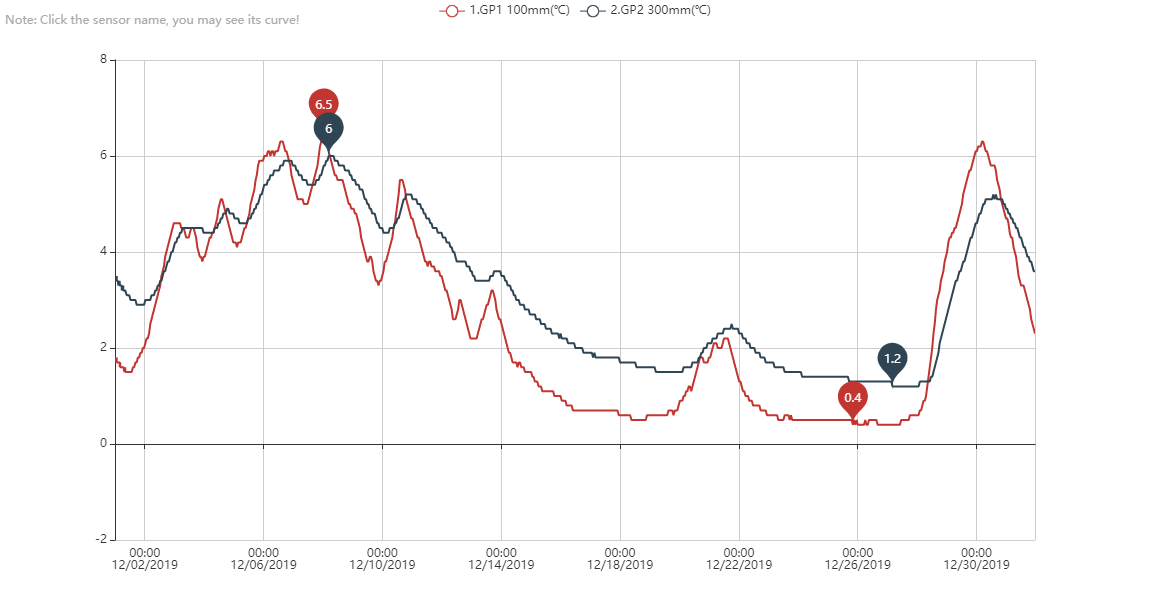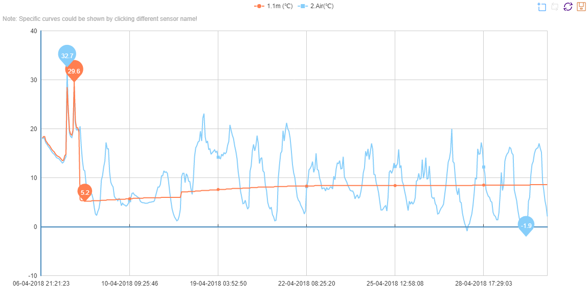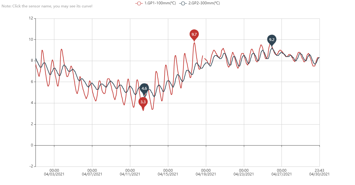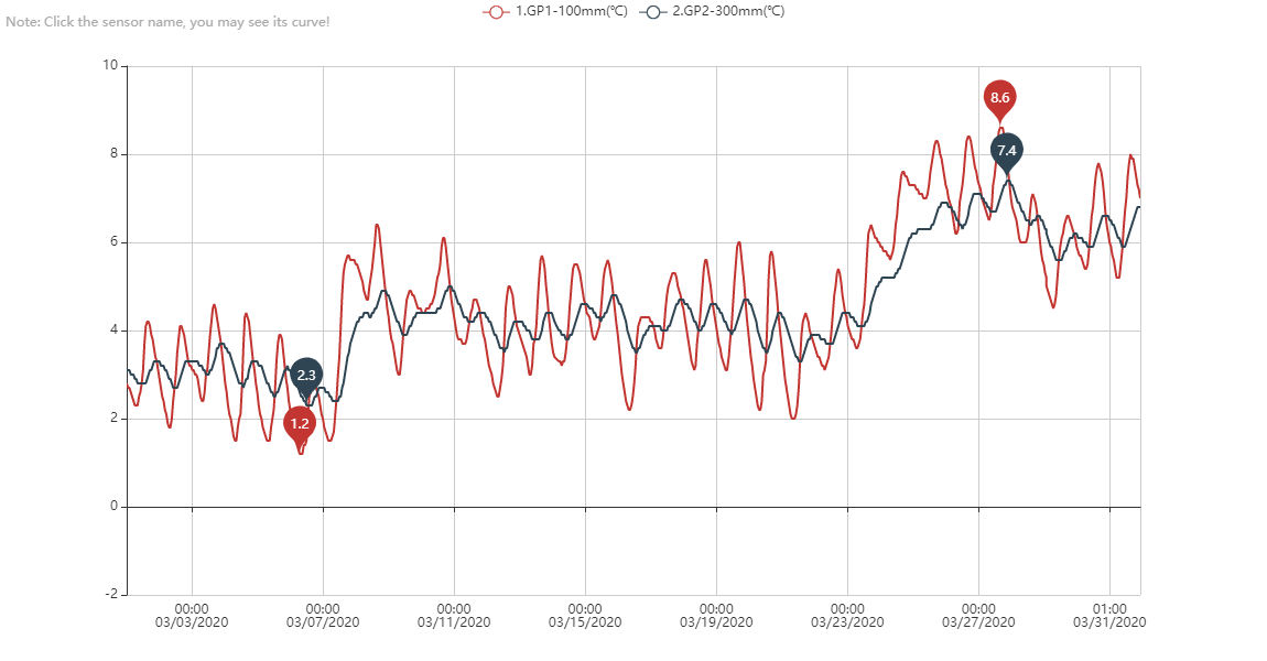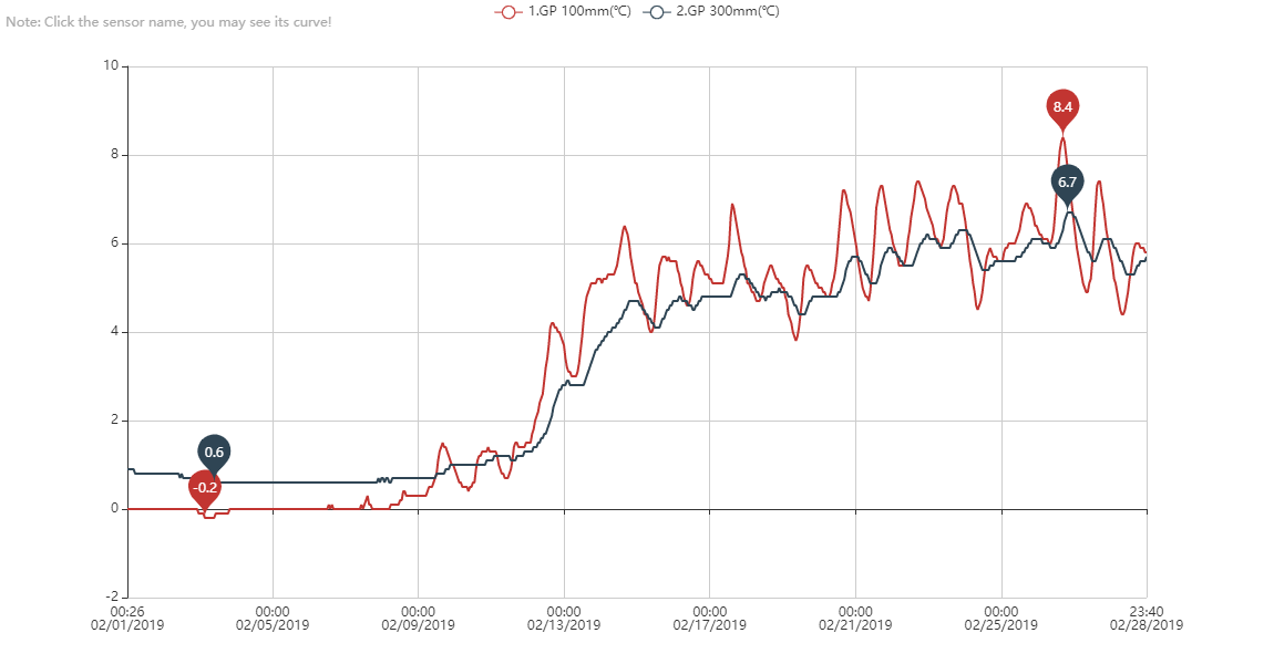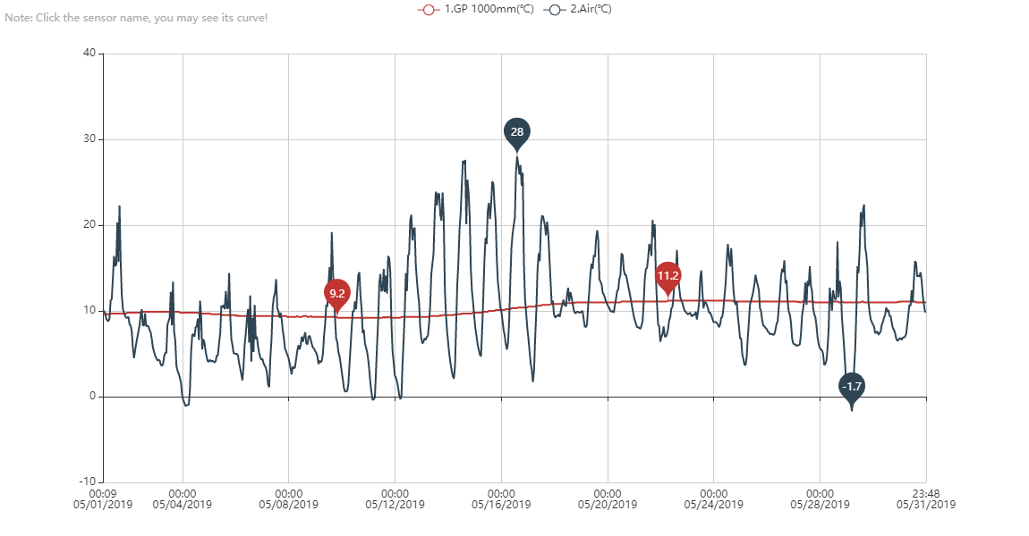 There are three GROUND PROBES set at 100mm, 300mm and 1000mm depths placed in an open grass field at the Millbank PWS Munlochy. The probes are attached to Elitech RCW-600 Intelligent WiFi Data Loggers. There is also one additional probe mounted inside a thermal screen set at 300mm above the grass that measures the air temperature as a control. Click on the probe depth below the date to access the data.