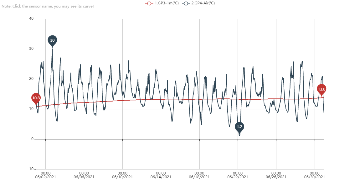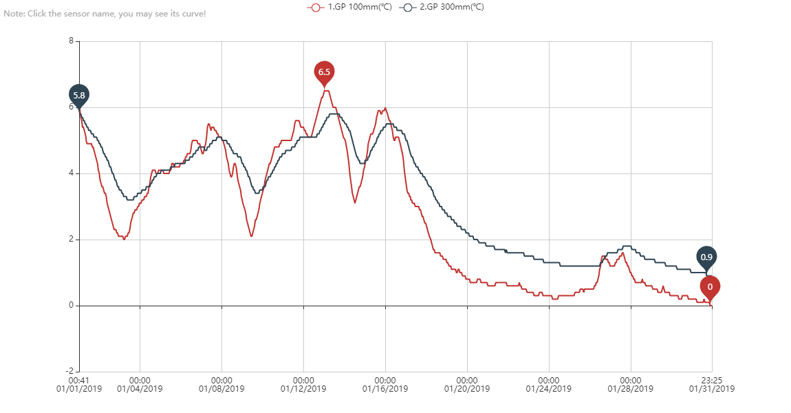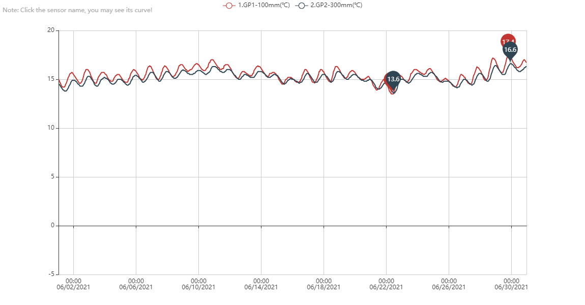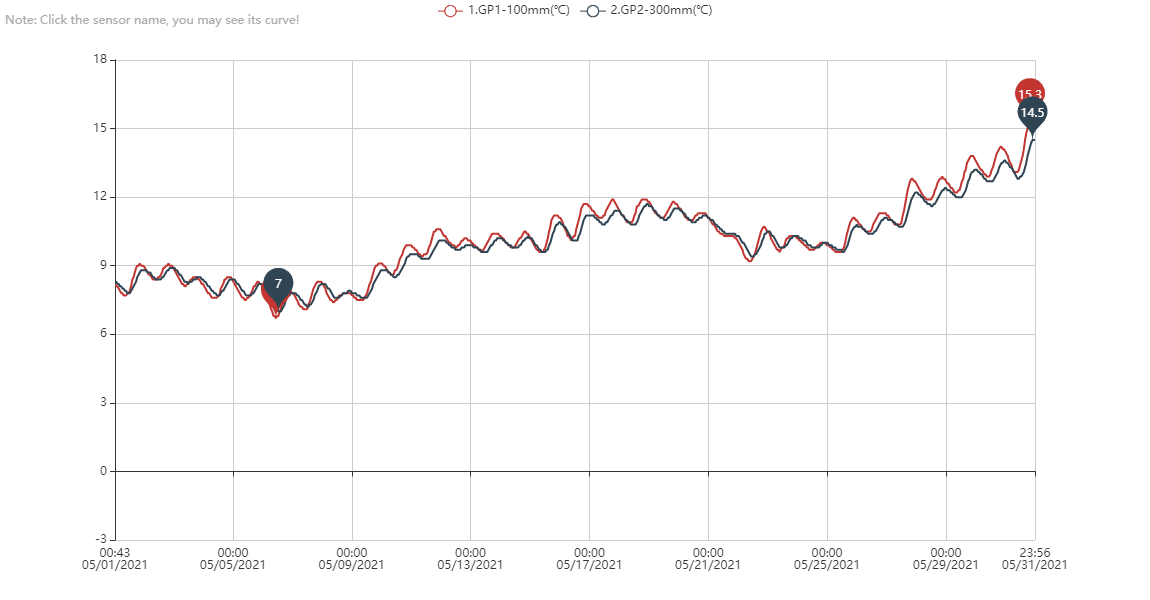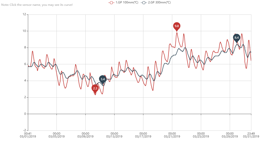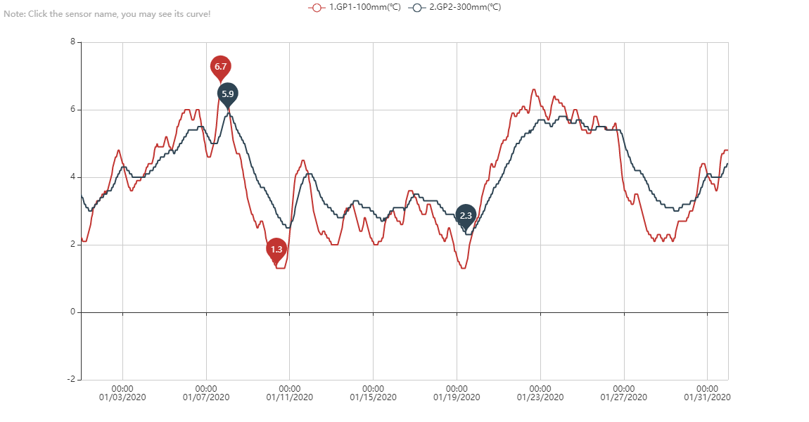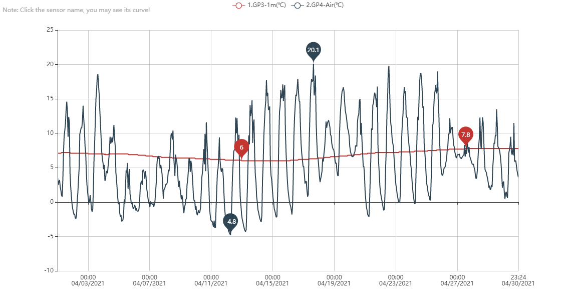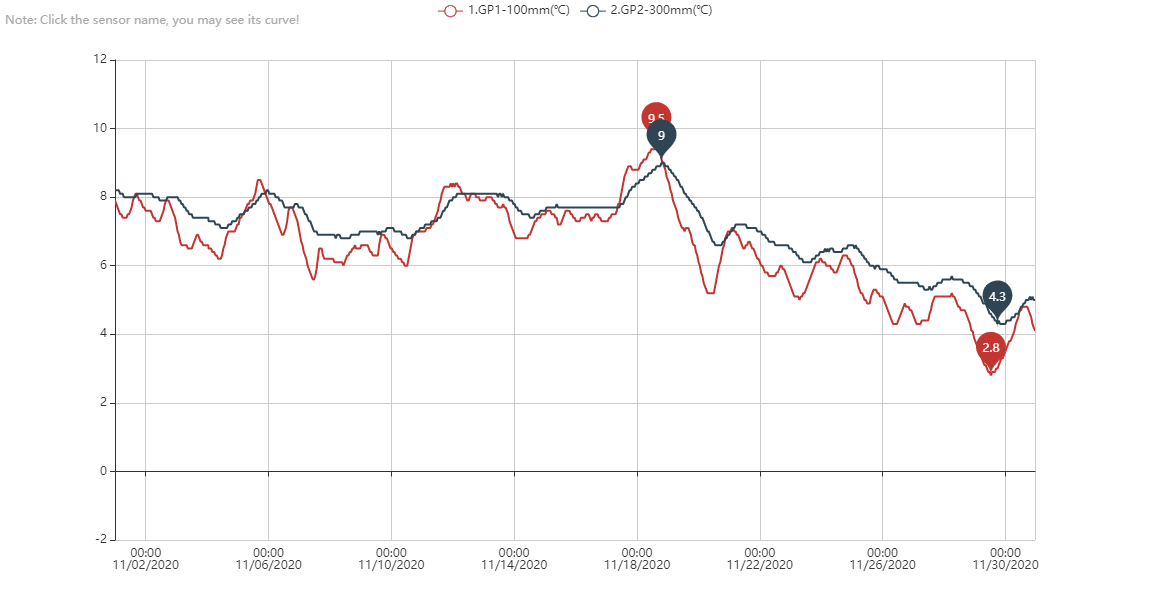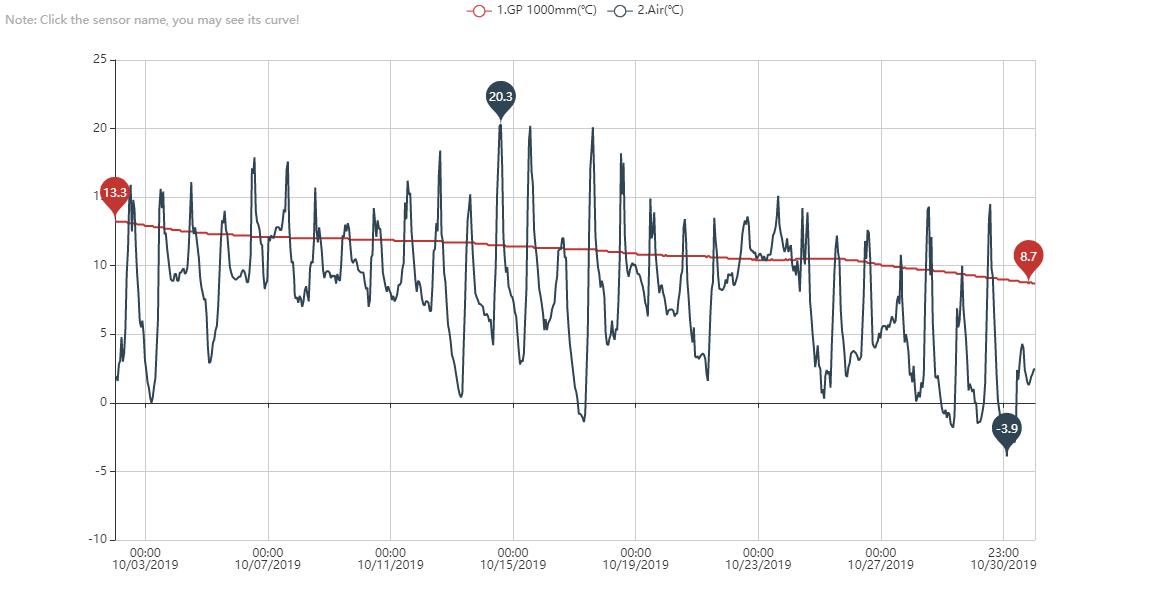 There are three GROUND PROBES set at 100mm, 300mm and 1000mm depths placed in an open grass field at the Millbank PWS Munlochy. The probes are attached to Elitech RCW-600 Intelligent WiFi Data Loggers. There is also one additional probe mounted inside a thermal screen set at 300mm above the grass that measures the air temperature as a control. Click on the probe depth below the date to access the data.