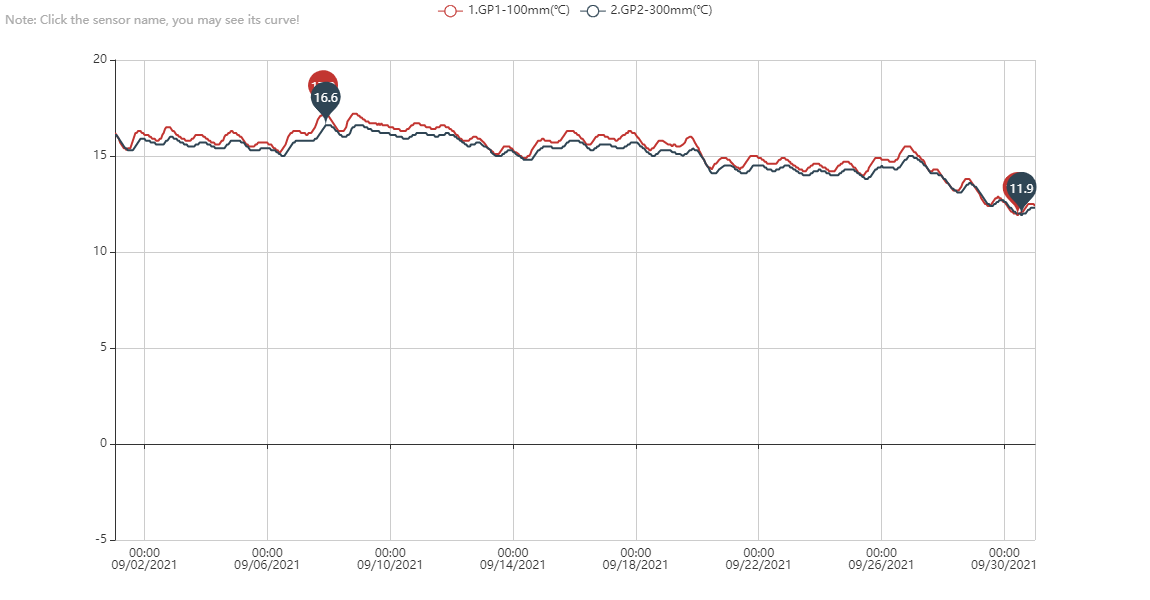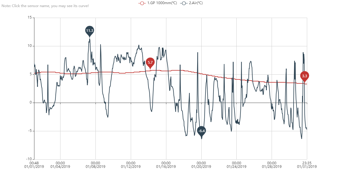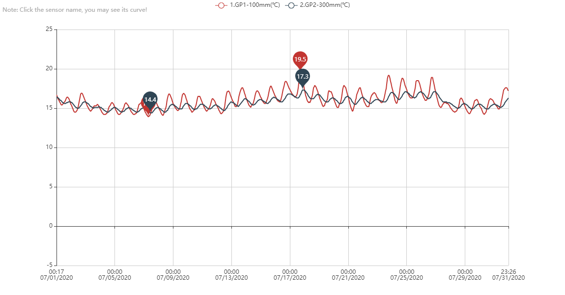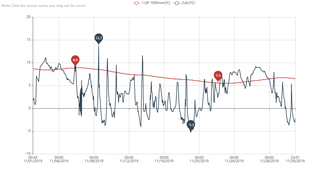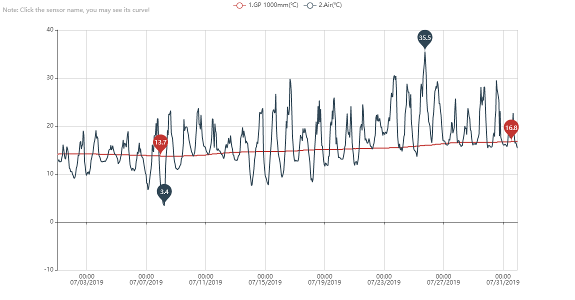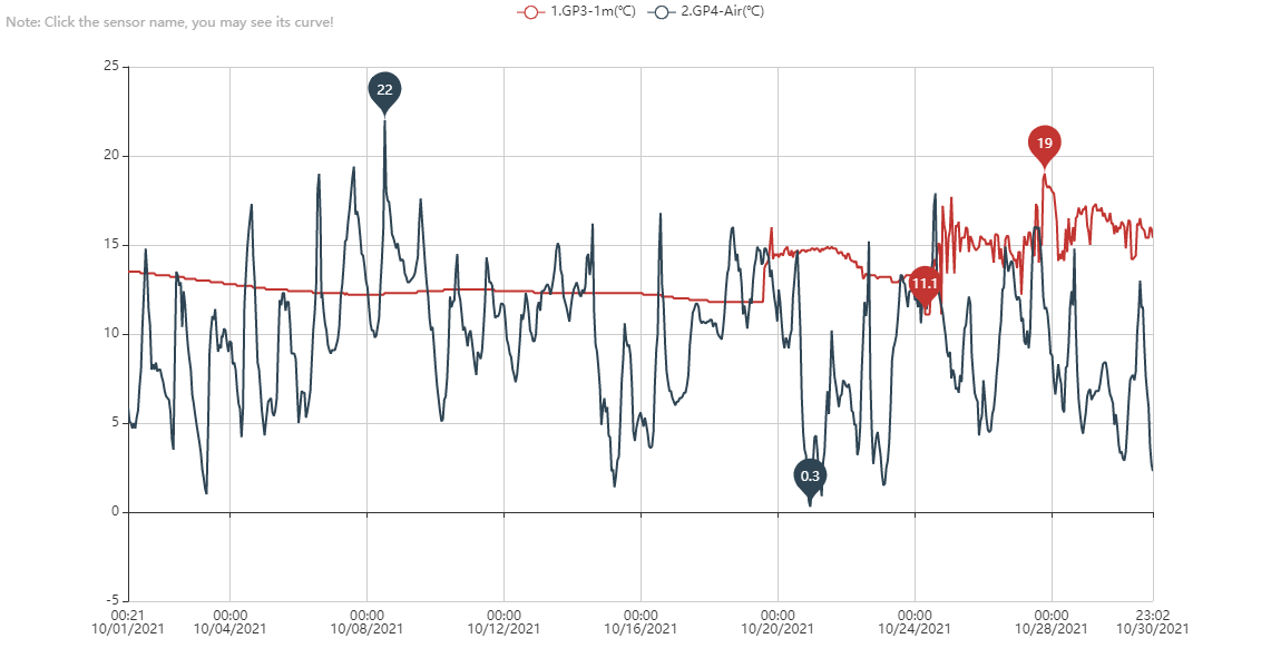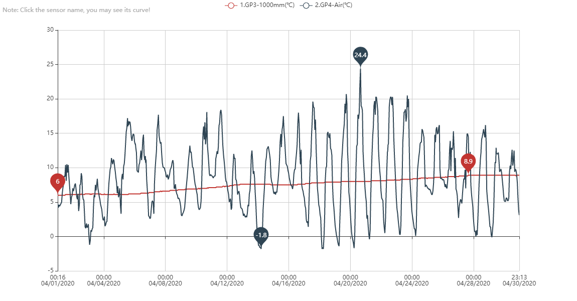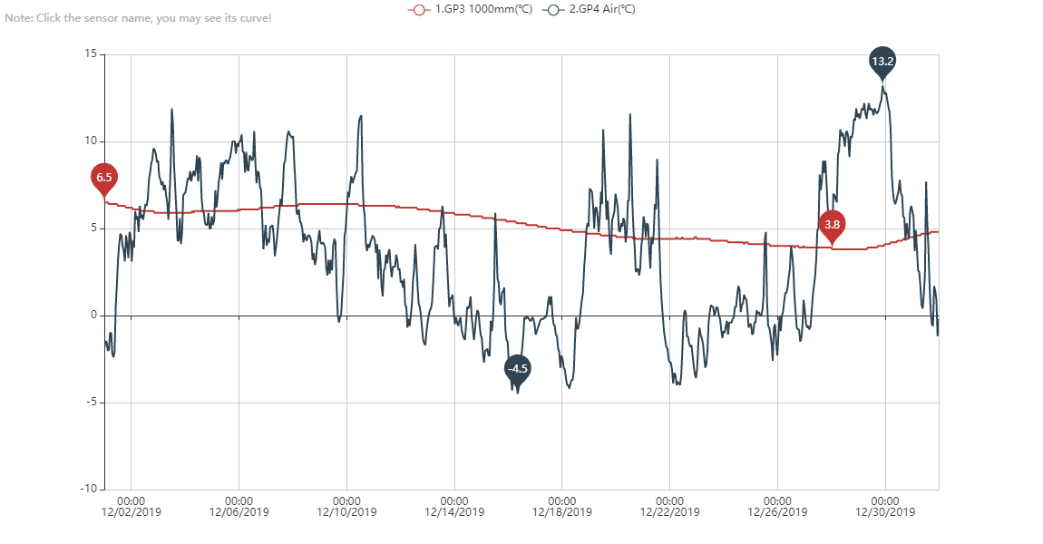 There are three GROUND PROBES set at 100mm, 300mm and 1000mm depths placed in an open grass field at the Millbank PWS Munlochy. The probes are attached to Elitech RCW-600 Intelligent WiFi Data Loggers. There is also one additional probe mounted inside a thermal screen set at 300mm above the grass that measures the air temperature as a control. Click on the probe depth below the date to access the data.