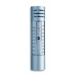 Metal min/max thermometer with black push button reset to view the night time minimum and the day time maximum temperatures.